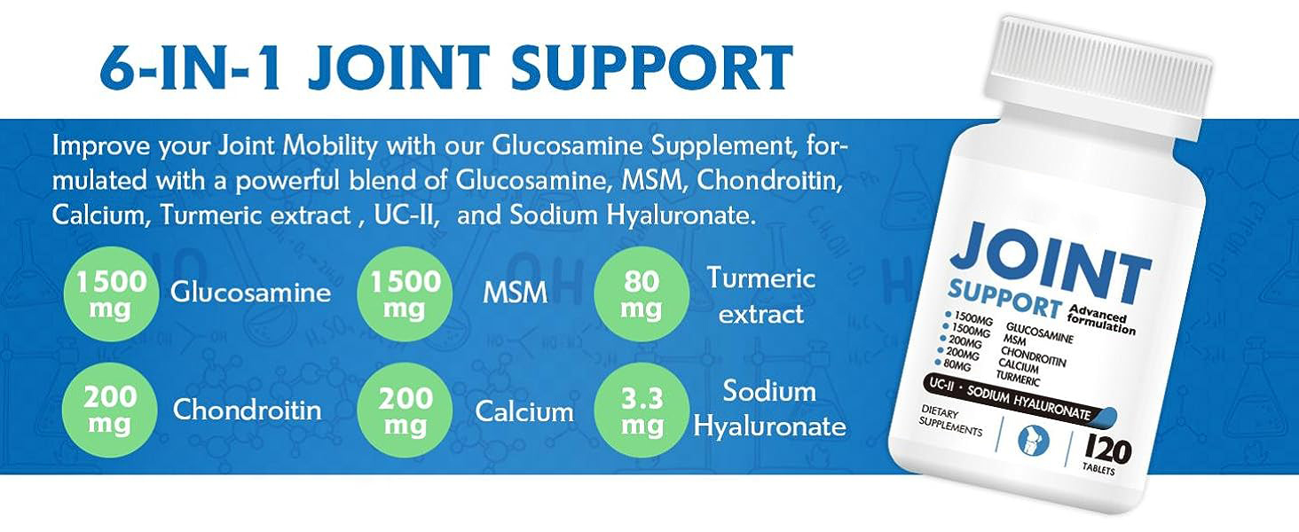 6-In-1 Extra Strength: Glucosamine Chondroitin with MSM, for women and men. every serving contains 1500mg glucosamine 1500mg MSM and 200mg chondroitin sulfate. In addition, formulated with calcium to help maintain hard bone density, Undenatured Type II Collagen (UC-II) and sodium hyaluronate to help strengthen joint mobility, and turmeric to help with a healthy inflammatory response. It will help you with your whole joint health.