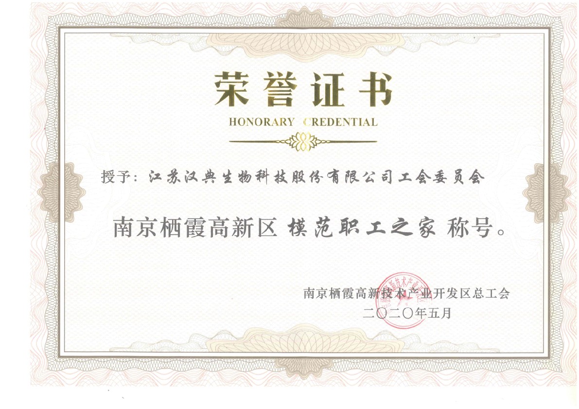 2020年5月,江苏汉典生物科技股份有限公司荣获得南京栖霞高新技术产业开发区总工会颁发的“模范职工之家”荣誉奖牌。此次获奖是南京栖霞高新技术产业开发区总工会对汉典工会工作的肯定,也标志着汉典生物工会工作迈上新的台阶。